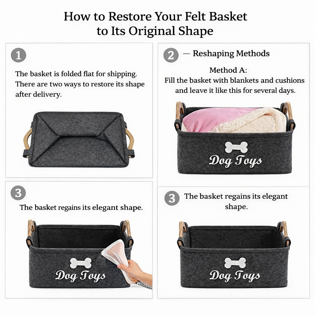 The FuzzyTidy Storage Box features a minimalist yet warm felt finish that looks great in living rooms, bedrooms, hallways or pet corners. Its sturdy build keeps it upright and accessible while remaining lightweight enough to move from room to room. The soft felt exterior also feels inviting — perfect for homes where comfort and design matter.